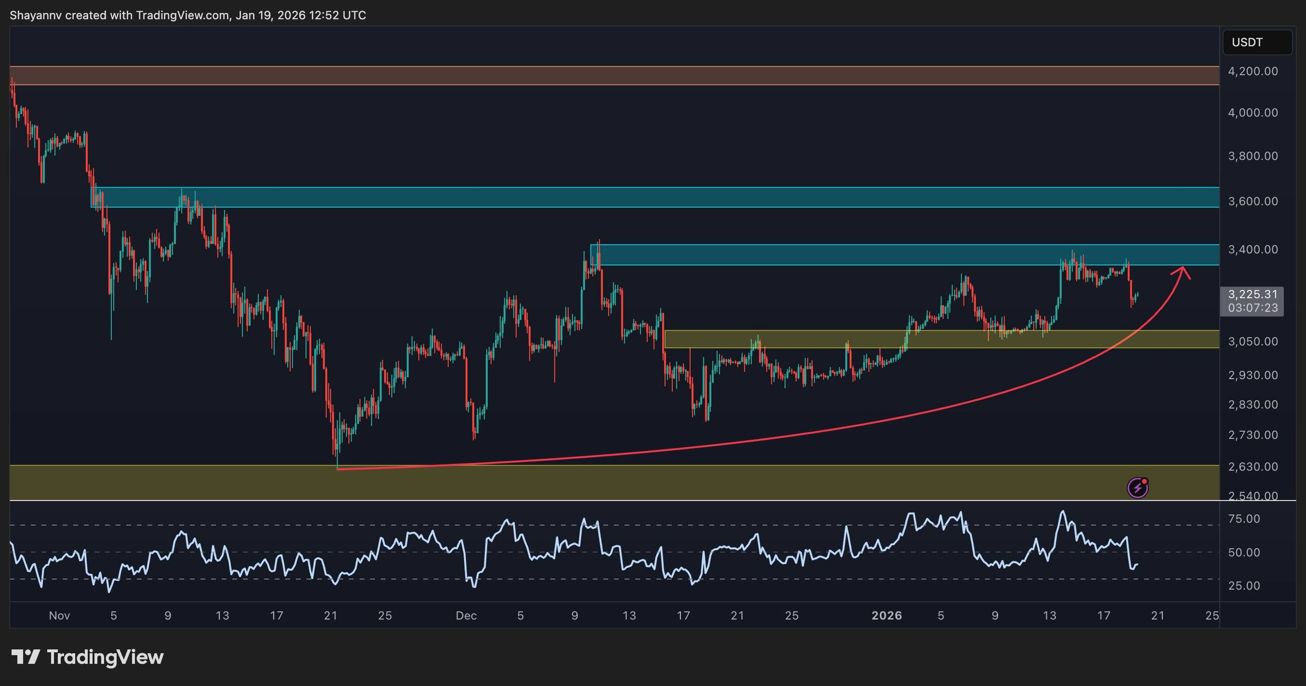 4-часовой график показывает явную последовательность более высоких минимумов с момента падения в декабре, формируя округлый паттерн накопления с последним локальным минимумом в районе $3,000. Цена колебалась между этой поддержкой и зоной сопротивления в диапазоне $3,300–$3,400, где продавцы вновь ограничили рост и вызвали откат за последние 24 часа.