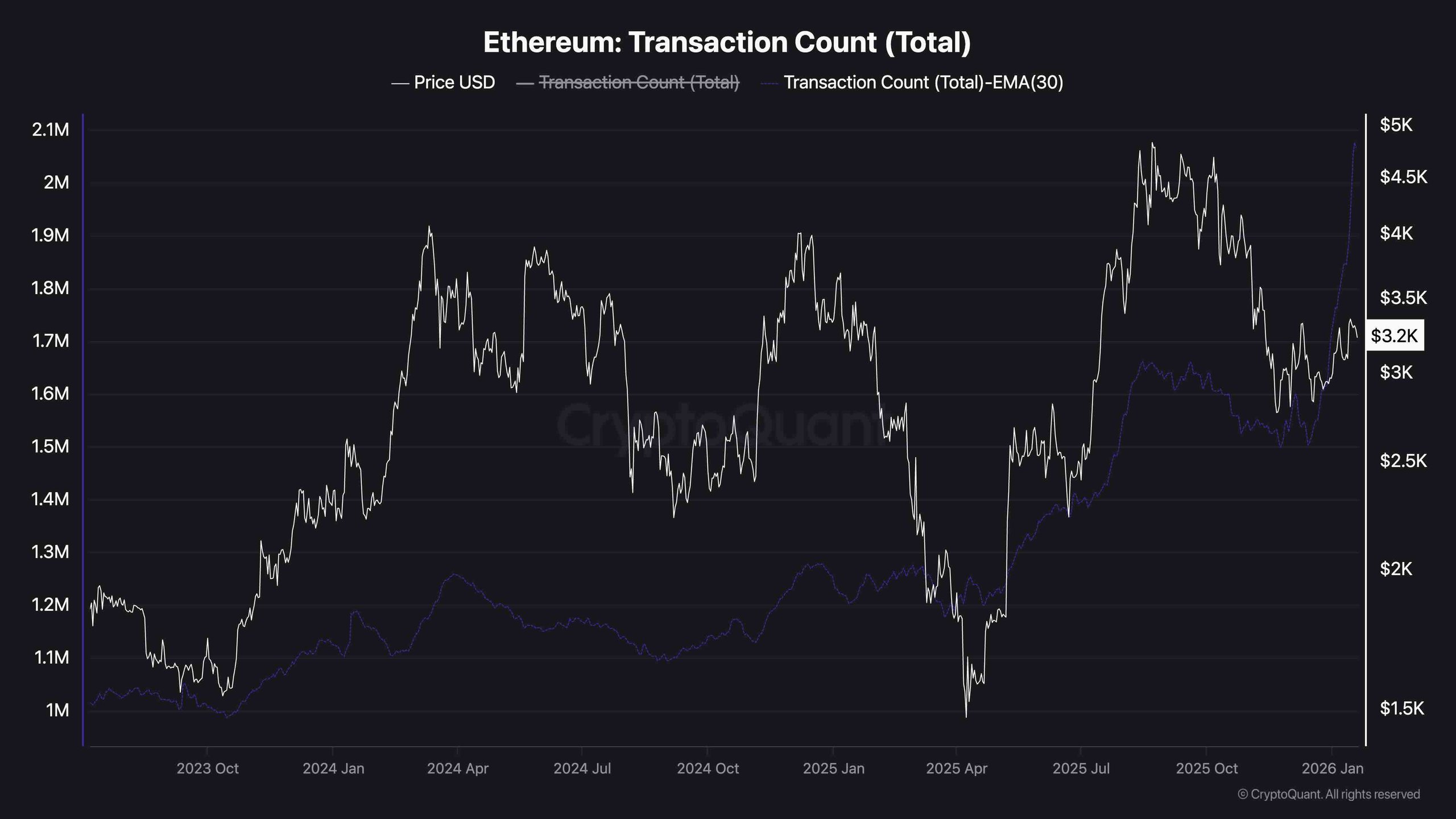 На блокчейне общий объём транзакций Ethereum и его 30-дневная скользящая средняя показывают рост и сейчас превышают 2 миллиона, несмотря на то, что цена остаётся ниже предыдущего пика цикла.